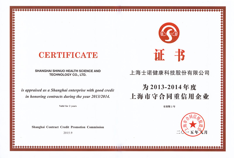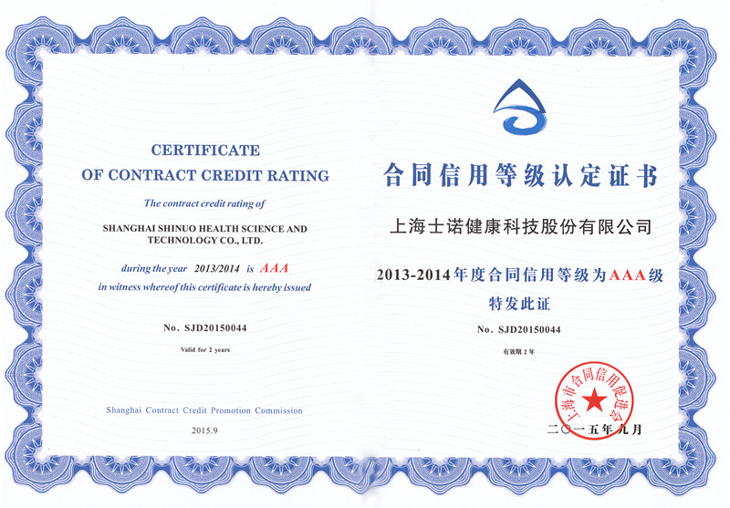 信用是企业生存和发展的基础,重合同守信用是企业的一项金字招牌,上海士诺健康科技股份有限公司(原上海超滤压缩机净化设备有限公司)一贯注重企业信用管理,树立了企业良好的信用形象,被上海市合同信用促进会授予“2013-2014年度上海市守合同重信用企业”、被认定为“2013-2014年度合同信用AAA等级”。