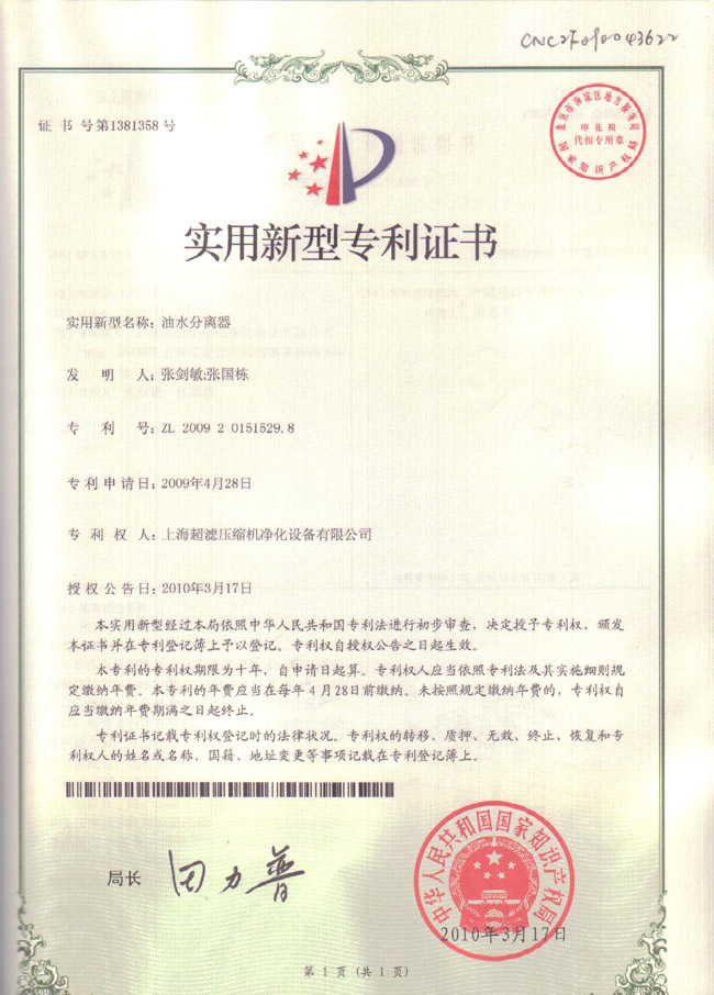 上海超滤压缩机净化设备有限公司自主研制的“阿普达”品牌油水分离器获得