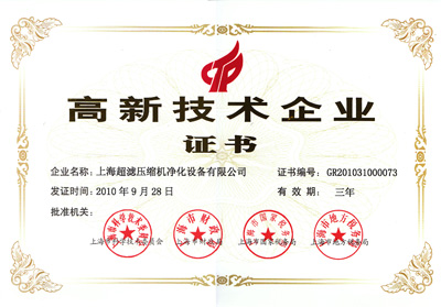 上海超滤压缩机净化设备有限公司被评为上海市“高新技术企业”。上海
