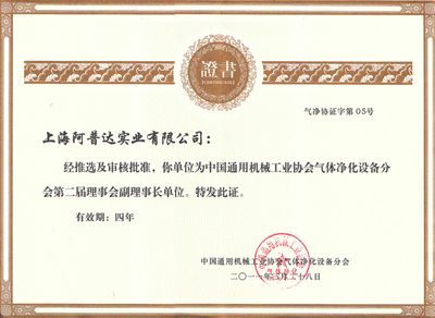 上海阿普达实业有限公司当选为中国通用机械工业协会气体净化设备分会第