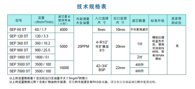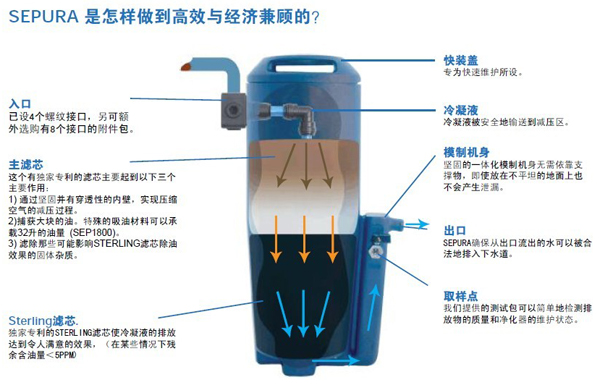 SEPURA系列冷凝液净化器用特别设计的过滤装置取代了传统分离器通常使用的溢流堰,也摒弃了冷凝液处理槽和油水分离仓,解决了传统油水分离器长期无法解决的一些问题,如:容易溢流、需要预浸泡以及分离效果差等。
